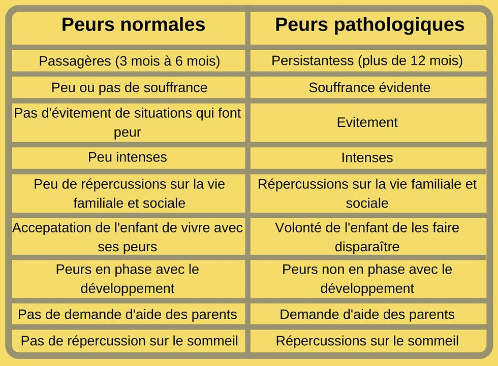 Il faut savoir distinguer la peur « normale » entraînant une résolution spontanée avec peu de souffrance et d'évitement ; et la peur « pathologique » étant durable, intense avec une souffrance et des évitements des situations anxiogènes. Les troubles anxieux sont les plus fréquents en enfance (prévalences annuelles de 6,5%) et les symptômes associés peuvent engendrer des répercussions importantes sur leur fonctionnement, lors de cette période développementale cruciale (Simard, 2019).